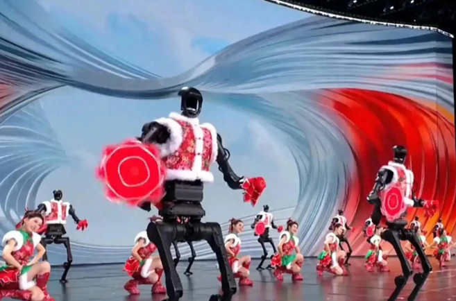 下图,2025年央视春晚,导演张艺谋编排舞蹈《秧 BOT》,这次的演出主角变成了宇树科技的黑科技机器人,通过各种复杂肢体动作让全世界的观众惊艳。
